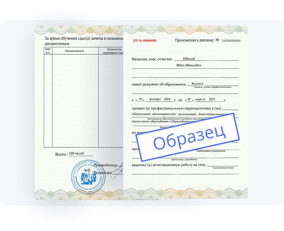 После завершения обучения слушатели получают диплом о профессиональной переподготовке. Он подтверждает квалификацию и дает право официального трудоустройства по новой специальности. Документ, выдаваемый нашим учебным центром, обладает такой же юридической силой, как и диплом о высшем образовании, признается по всей территории России.